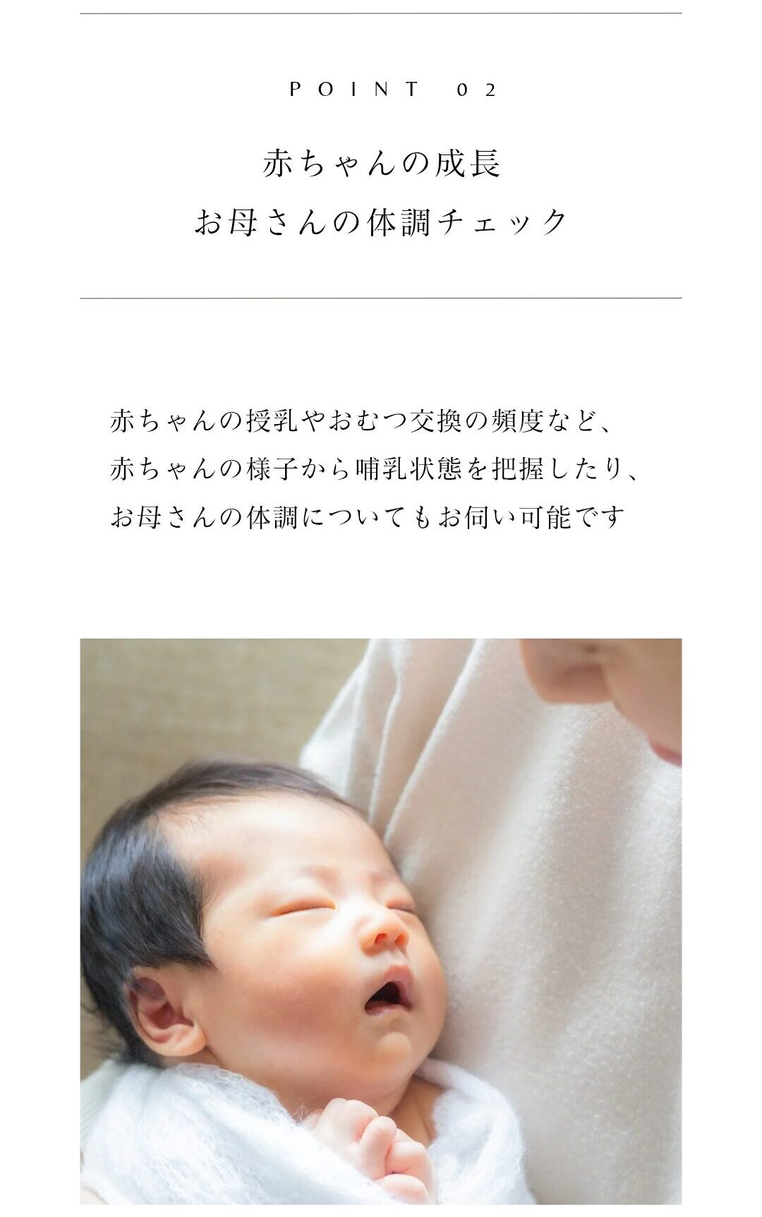 赤ちゃんのペースを大切にしながら、退院後間もない生活での不安や悩みに対応します